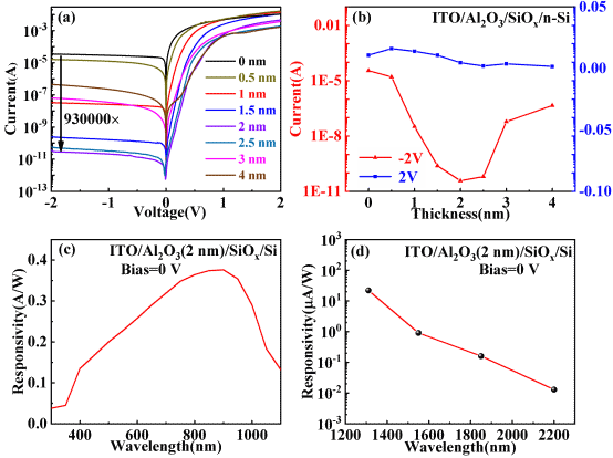 图1. (a-b) 不同 Al2O3 厚度器件暗电流,(c-d) 300-2200 nm宽谱响应。